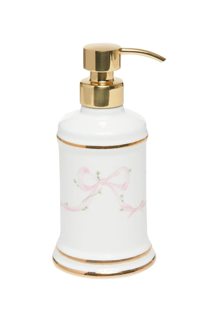 Dress up your wash station with this handmade porcelain soap dispenser with our signature LoveShackFancy pink bow. Made in the English Countryside by The Present Company, this dispenser can hold lotion, mouth-wash or soap. Shown here in Pink Bow.