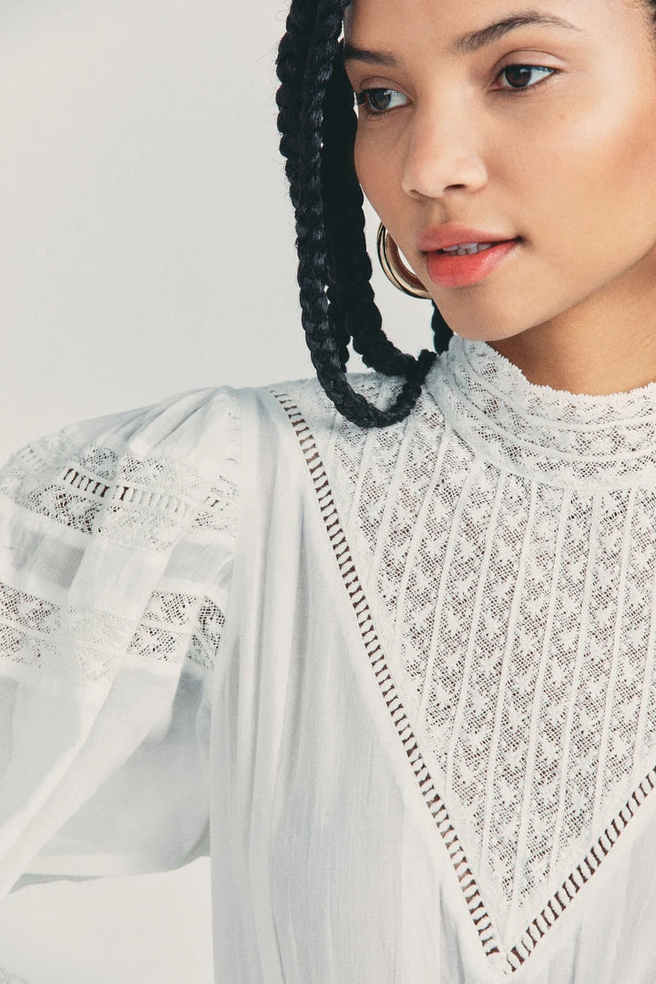 Our Victorian-inspired Viola Dress arrives in custom dobby cotton with inset floral lace and lofty wildflower embroidery. This relaxed frock has a high collar and an inset triangular lace yoke above an elastic waist. A hidden placket with center buttons lines the back. Shirred elbow-length puffed sleeves are finished with a pintucked cuff, mirrored by pintucking at the top panel of the miniskirt. Shown here in Antique White. Accessorize your mini with our LoveShackFancy x Lova Dolce Vita Heart Flower Earrings.