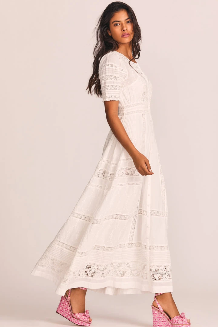 Our new Kylen Victorian Maxi is a must-have dress of the season in 100% cotton voile with schiffli embroidery, pintucking and a mix of custom embroidered and crocheted laces in geometric pattern play. This easy transitional frock has a scoop neck, mother-of-pearl buttons that descend from top to bottom and shirred shoulders above elbow sleeves. Accessorize this with our Lorna Barrette. Shown here in True White.