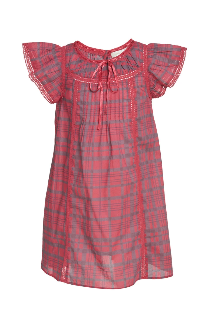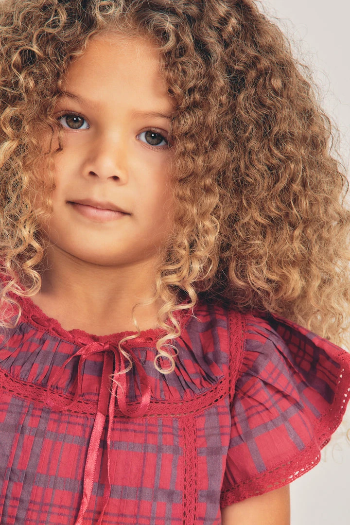 Our Flutter Sleeve Gown for girls is back in our signature holiday plaid print. This easy frock features raw-edged lace that trims the scoop neck and flutter sleeves. The bodice and back have intricate detailing like inset custom lace and pintucking. Shown here in Moody Ruby.