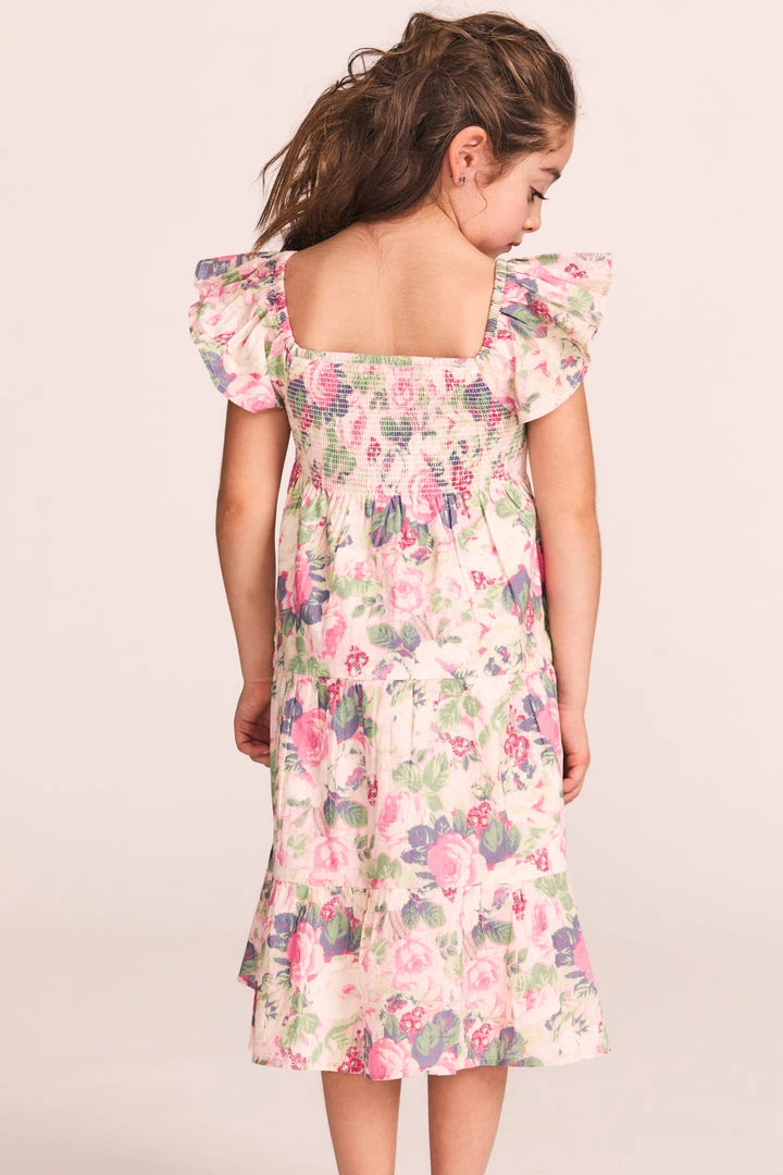 Run barefoot in the grass in our Malinda Dress, dreamy in 100% cotton with this season‰۪s hero hand-painted rose print. This flowy frock has a square neck, puffed sleeves, a smocked bodice and shirred panels down the full sweep skirt. Shown here in Veiled Kiss.