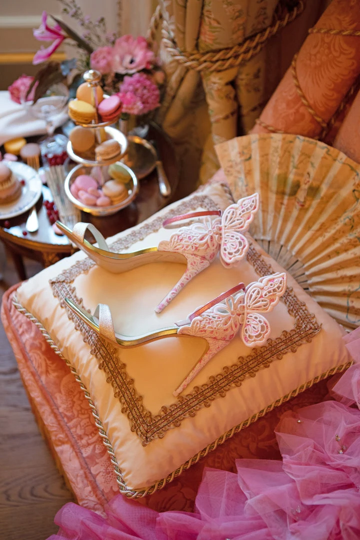 LoveShackFancy x Sophia Webster collection is here! Sophia Webster’s Chiara Sandal silhouette is back & comes with a LoveShackFancy revamp of pretty in pink rosebuds, a vibrant hot pink strap with a dreamy teal colorway on the sole. This heel is finished with its signature embroidered butterfly. Shown here in Antique Rosebud.