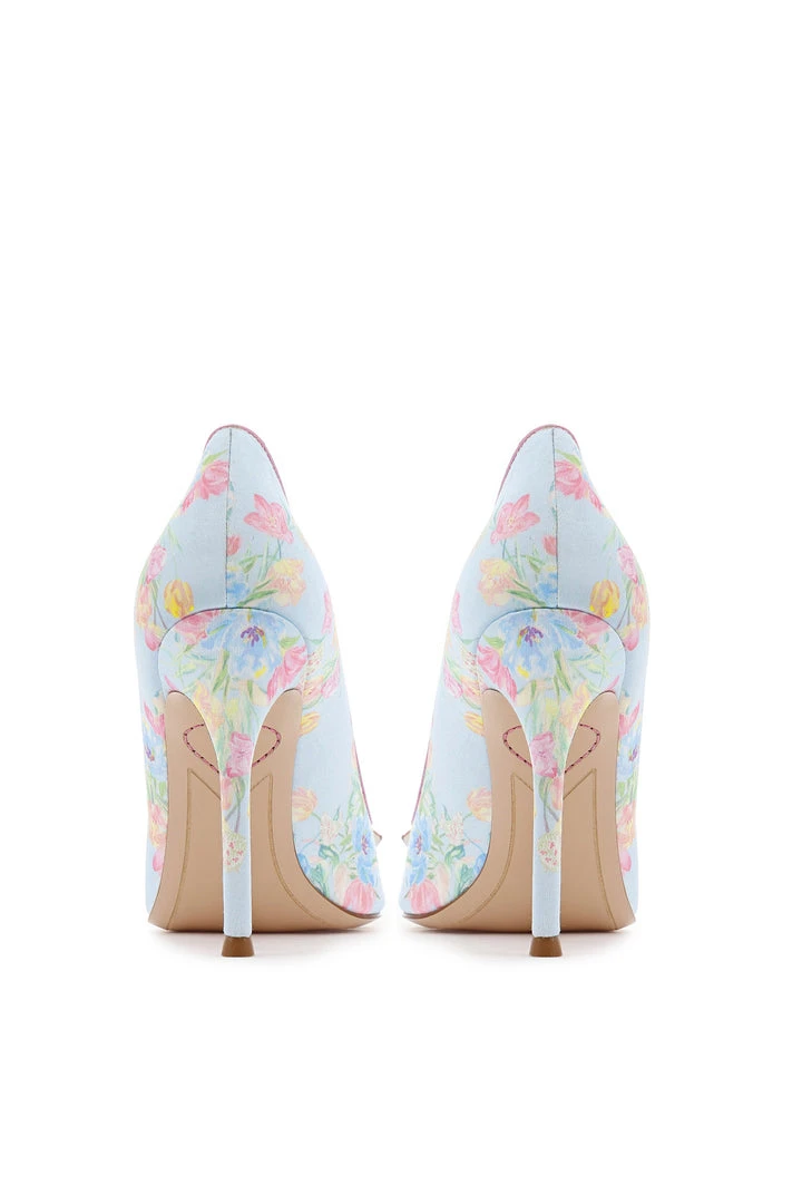 LoveShackFancy x Sophia Webster collection is here! Meet our take on Sophia Webster’s classic Margaux Pump. This modern Cinderella heel is elegantly designed with a dreamy powder blue colorway featuring hand-painted florals throughout. This shoe includes its signature, ethereal pastel rainbow Margaux buckle. Shown here in Sky Lullaby.