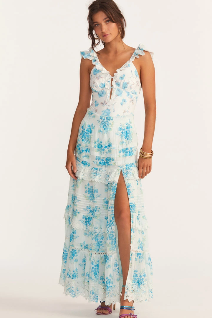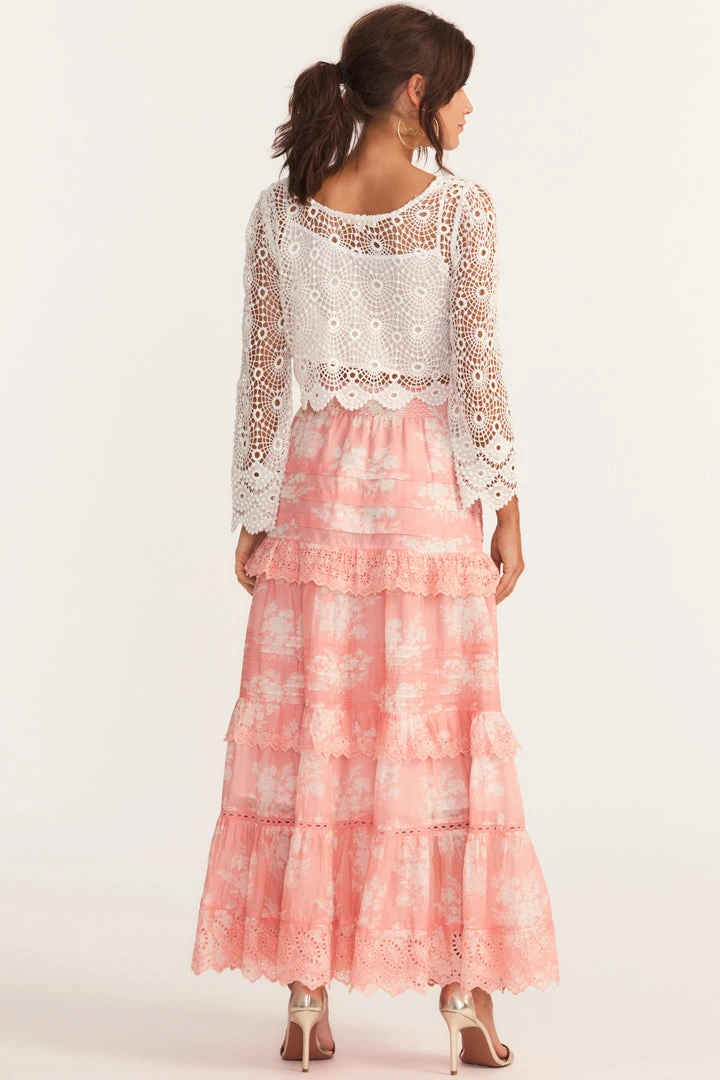 Our new Ariah Skirt is what dreams are made of in 100% cotton. This maxi skirt features a smocked, elastic waist with narrow and wide tucking throughout, a floral embroidery, intricate schiffly eyelet detailed ruffles and satin ribbons amongst custom lacing. Wear it with our Daxi Crop Top.