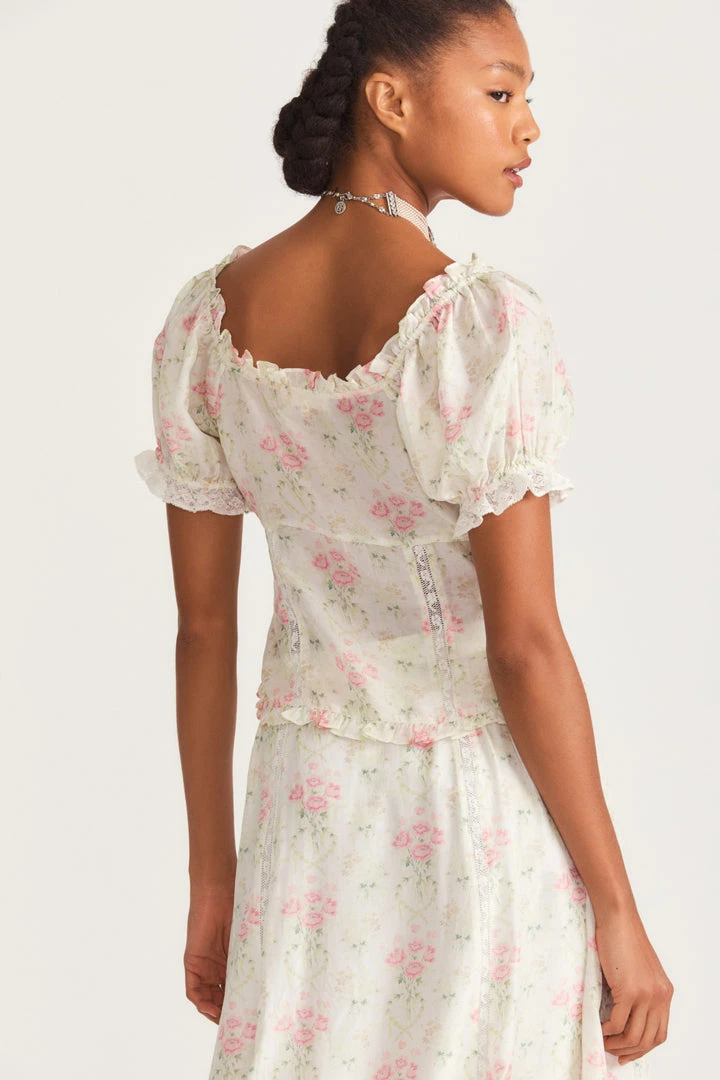 Our Creative Director, Rebecca Hessel Cohen’s favorite Bryant Top makes its return in an airy, silk fabric for the first time, with our hero print of the season, Belfast Habotai. The elevated, lightweight top channels all the Bridgerton vibes with sophisticated design details; a peplum cut with slight shirring, and intricate custom laces. Wear it as a set with our Navya Skirt. Shown here in Baby Pink Dreams.