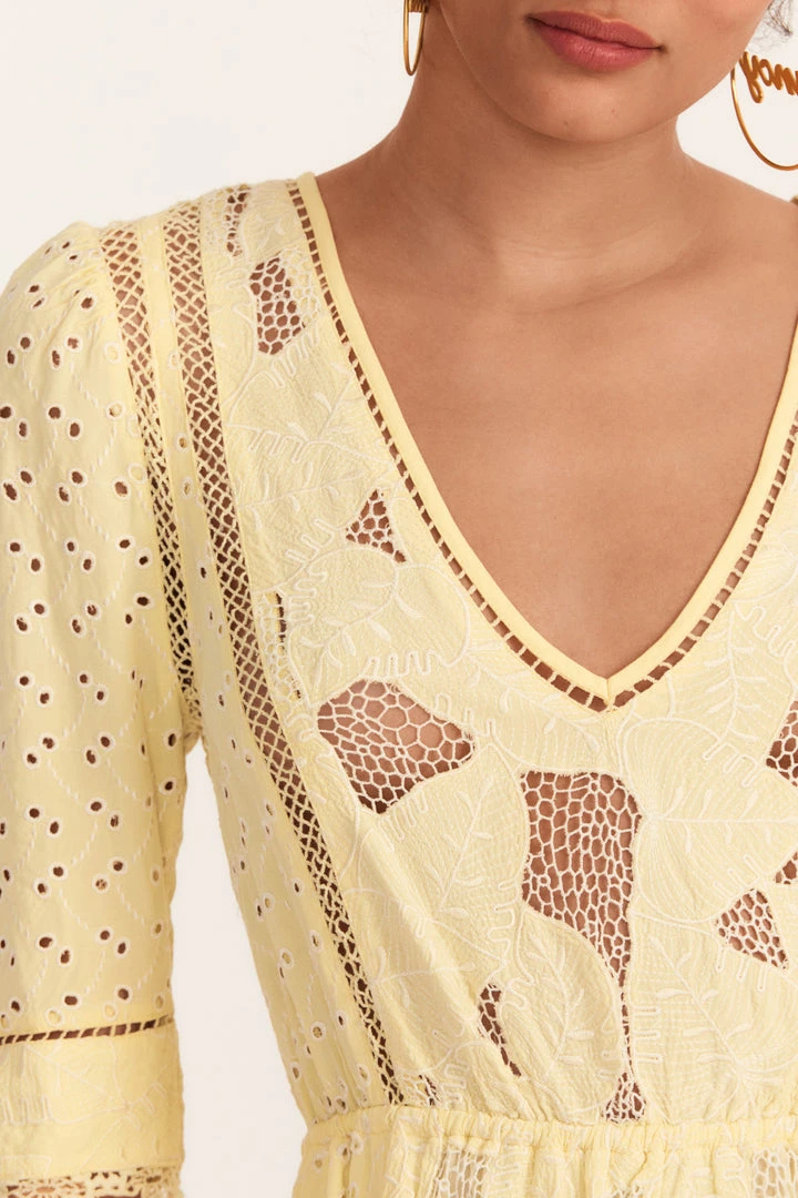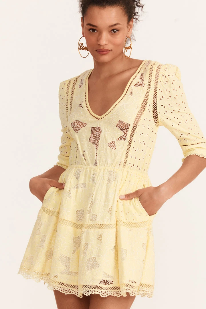 Our always-adored Victorian Jobelle Dress arrives in a combination of eyelet embroidery and custom, palm cutwork fabric. This day-to-night frock begins with a v-neck, dreamy elbow sleeves and a custom lace inset with elastic at waist center for a breezy feel. This dress features a black keyhole with hook and eye detail along with functional pockets. Accessorize it with our LSF x Sophia Webster Celia Platform Sandal. Shown here in Lemon Sun.