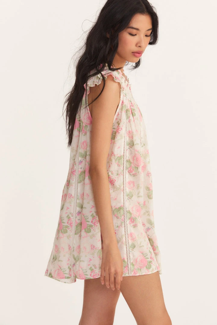 Sweet dreams only in Our Finchley Dress in airy 100% cotton with custom lace details and top-applied mini rosettes. This relaxed night gown has a scoop neck, encircled by ruffles and smocking and framed by short flutter sleeves. Accessorize your mini with our Chaumont Smocked Scrunchies.Â