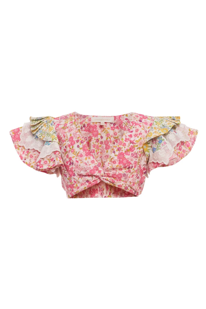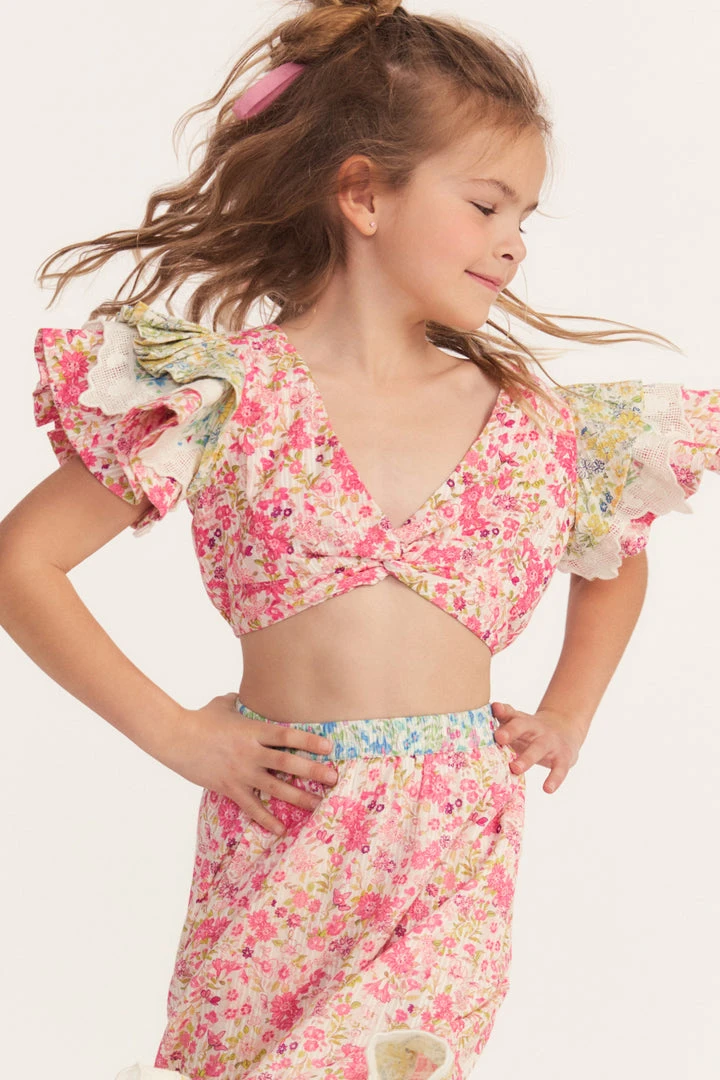 Sweet as can be in our Judy Top with a multi-colored floral print. This cutie top has a slight v-neck with a ruched center front and ruffle-adorned flutter sleeves. Wear it as a set with our Elias Skirt. Shown here in Fruity Punch Colorblock.Â