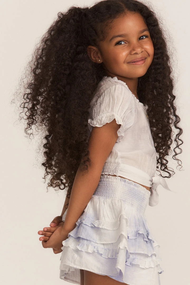 This darling cotton blouse blossoms in a subtle heather blue hand dye. With a ruffled, circle neck and matching short sleeves, this blouse is shirred with buttons down center front and a sweet wrap-around bow that ties around the waist. Pair it with our Girls Billie Skirt. Shown here in Heather Blue Hand Dye.