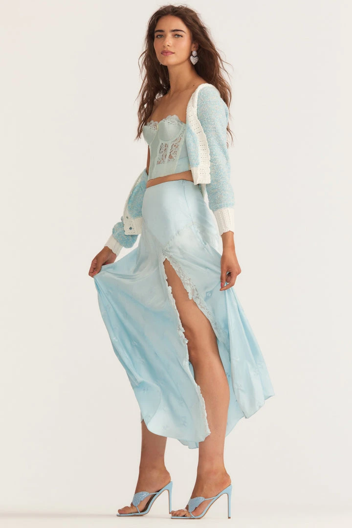 Introducing our Gracia Skirt, an irresistible silk maxi skirt inspired by sourced vintage slips. Our beloved Ziggy Skirt gets a seasonal update featuring a high slit, princess seams and custom lace embroidery detail throughout. Wear it with our Geneve Crop Cardigan. Shown here in Angel Blue.