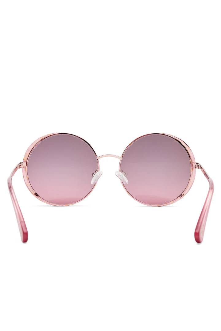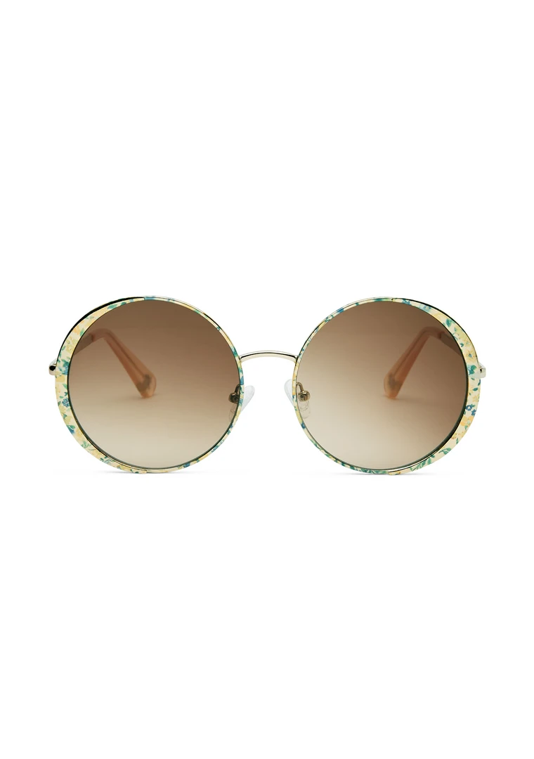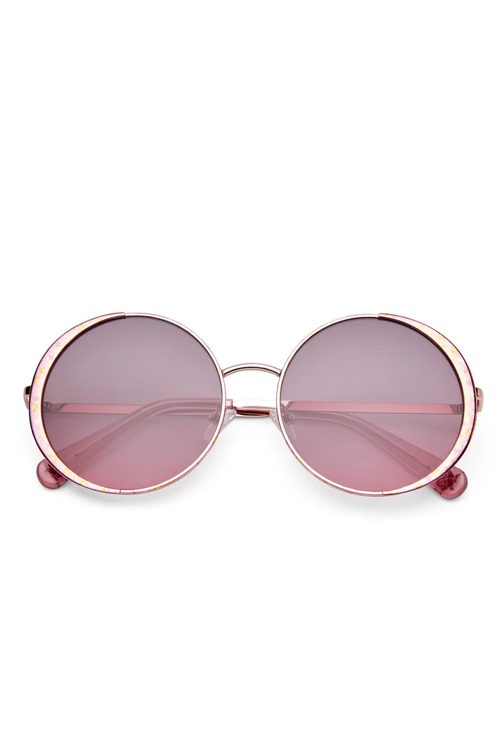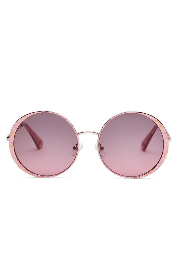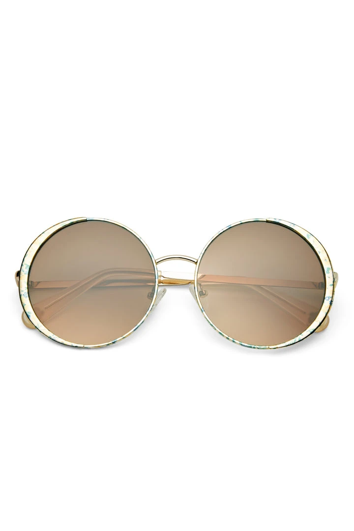 Channeling our inner 70s goddess in these vintage-inspired shades. These sunglasses feature an oversized, round shape with a sleek outside print for a modern finish. Wear them with our Audrina Mini Dress.Â