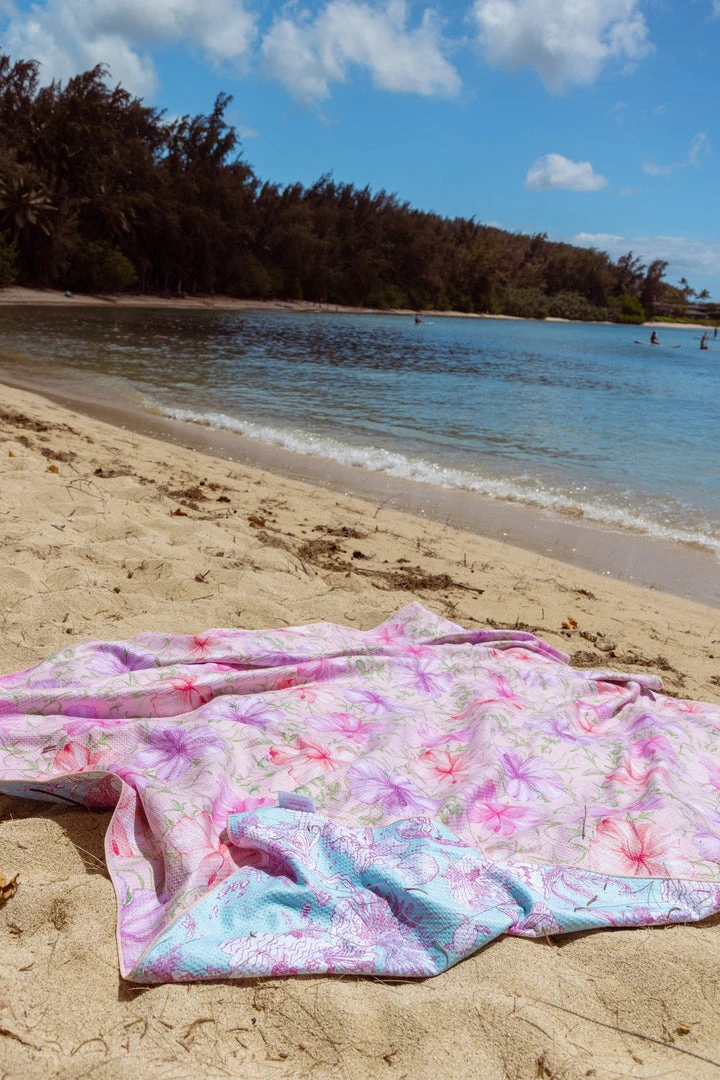 Dry off and lay out with the LoveShackFancy x Hurley Under The Sea Rectangle Towel. This two-sided towel features a playful aqua-colored mermaid print on one side and a bright pink and purple hibiscus print on the opposite. Pair your towel with our LoveShackFancy x Hurley One Piece Swimsuit.