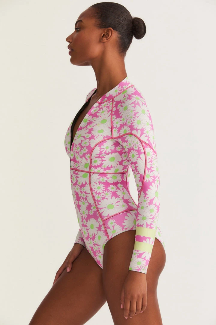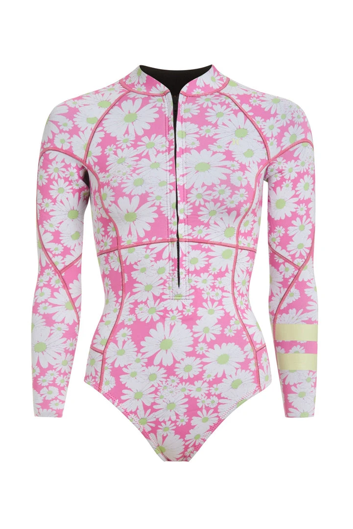 Hit the waves in this epic LoveShackFancy x Hurley Springsuit. This major long-sleeve suit is designed with top-of-the-line wetsuit technology and has the prettiest bright pink and white daisy print with two stripes on the left arm and a center-front half zip. The suit features max support fabric with UPF50 sun protection all over. Pair it with our LoveShackFancy x Hurley Reversible Cheeky Bikini Bottom. Shown here in Palm Fronds.