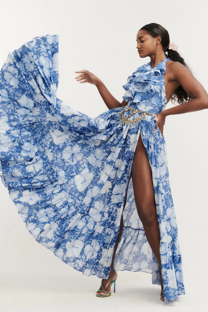 A seaside vision in our new Marinette Dress with a cotton silk fabric and mermaid, hibiscus print. This low cut halter top features an exaggerated ruffle. This maxi dress features a mermaid, hibiscus print with a fitted bodice above a pleated skirt with a high, flirty slit. This dress features functional pockets. Accessorize it with our LSF x Lova Flower Gold Earrings. Shown here in Salty Sea.