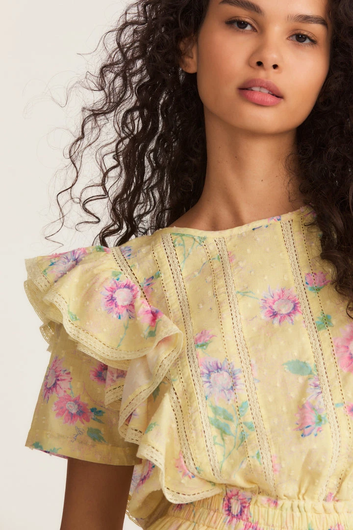 Our signature Natasha Dress is back for the summer in a dreamy, new floral print. This easy frock features double ruffled flutter sleeves, which cascade down the front and back of the body to highlight the elasticated waist. Intricate custom lace panels are inset and trim the skirt’s flounces.