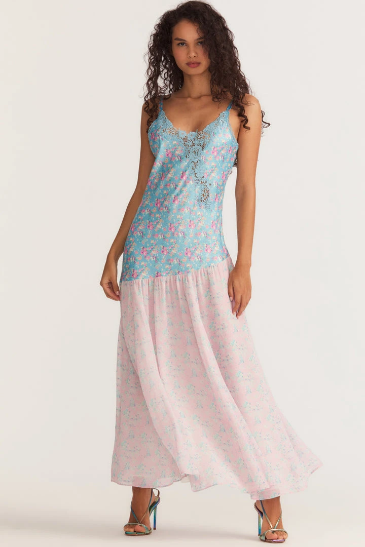Strutting through the season in our new Rhoda Dress. This major maxi is adorned with intricate paneling detail in custom, sheer lace lining the frock and the trim. Channeling all the summertime feels in a technicolor neon, colorblock daisy print. This dress features adjustable straps. Accessorize it with our LSF x Lova Dolce Vita Heart Flower Earring. Shown here in Fuji Sunrise Print Mix.