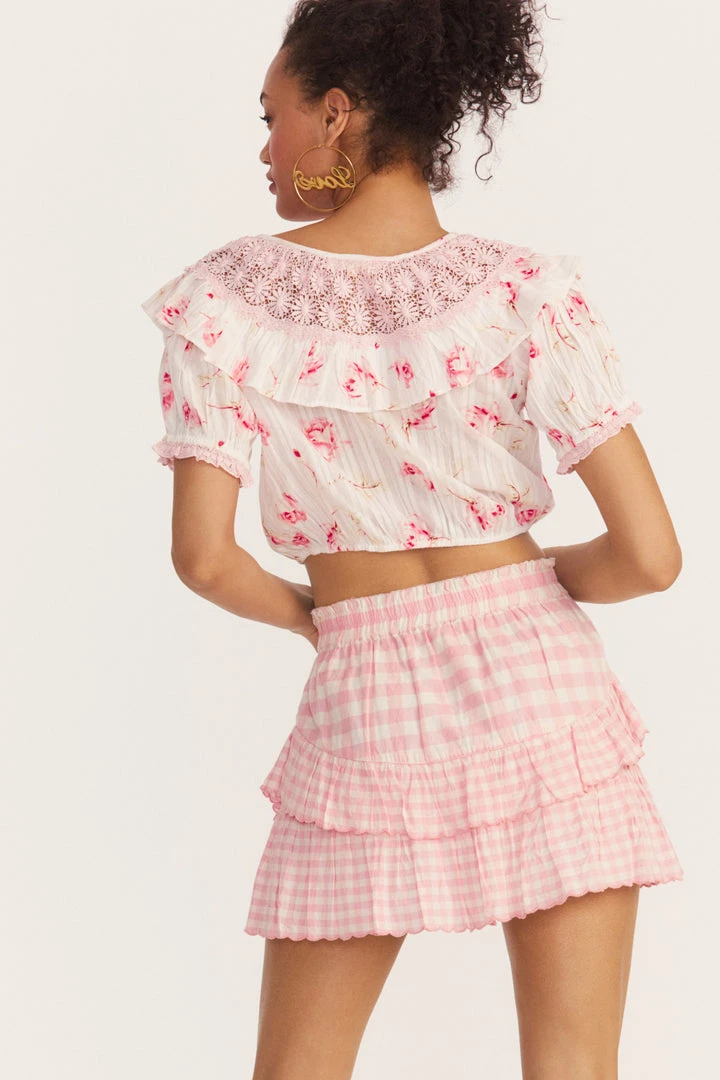 Having a pink moment in our Shae Skirt in our Lido Check Cotton. This three-scaled skirt features medium and micro printed checks with scalping embroidery at each tier and comes adorned with custom lace and tucking throughout. Pair it with our Elania Crop Top. Shown here in Groovy Pink.