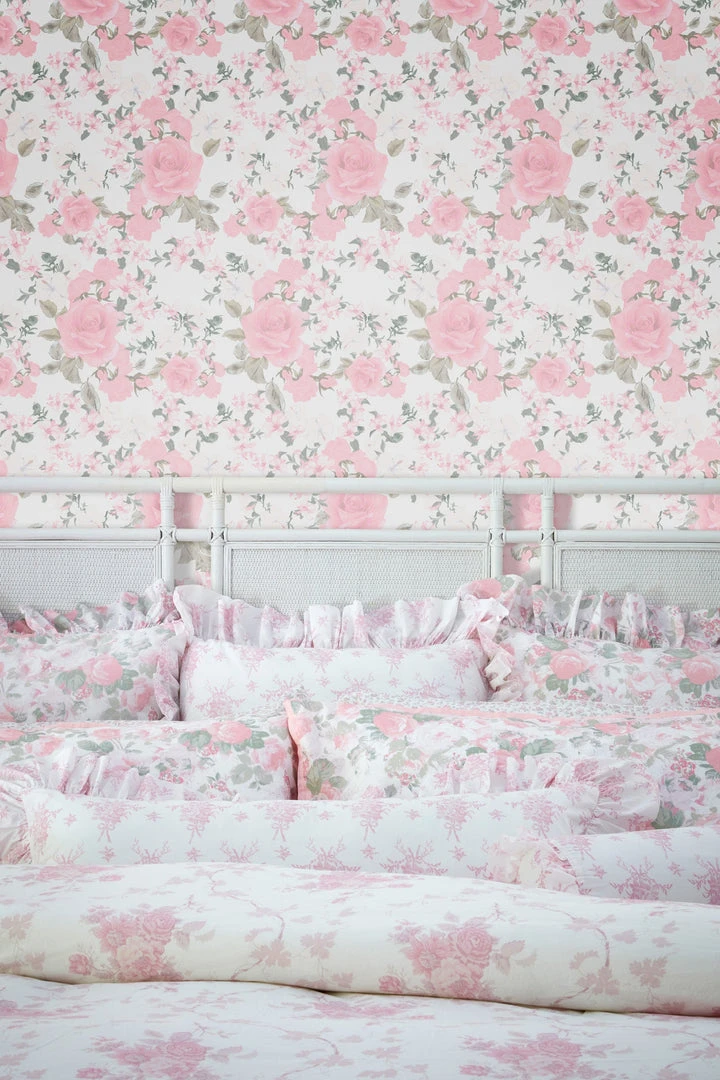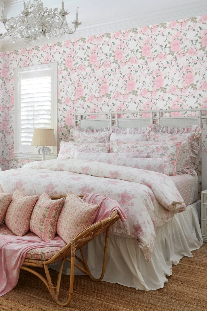Ethereal florals from floor to ceiling feature giant pink roses with smaller baby blush and white hibiscus flowers. Mix and match with our Palm Beach Rose Duvet Cover & Sham Set. Shown here in Vida Rosa.