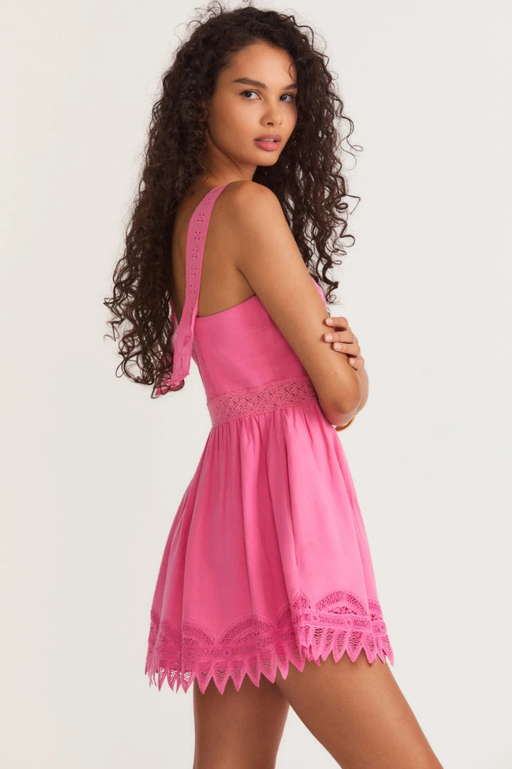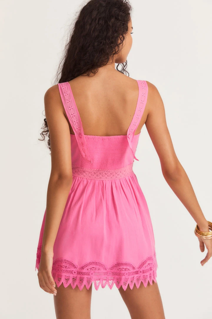 Our new Tariah Pinafore Dress was made for easy, breezy beach days. This airy mini steps onto the scene in a new fabrication with engineered custom battenburg lace. The dress begins with functional, lace-adorned straps fastened onto a square neckline leading to a fixed waist above a lightly ruffled skirt with eyelet embroidery on the trim. The dress includes elastic and a side seam zipper. Accessorize it with our LSF x Sophia Webster Alba Mid Sandal.Â