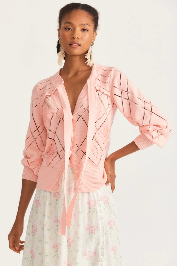 Forever swooning over our new Rayla Cardigan. This diamond pointelle knit is cozy perfection with the most stunning tonality of purely peach tones. Details include top-applied chemical custom lace panels, hand-crocheted finishing around the neck, functional center-front tie detail and keyhole with functional buttons. This cardigan is finished with a decorative, exaggerated center front tie. Wear her alone or over your favorite LoveShackFancy top. Pair it with our Navya Skirt. Shown here in Winter Blush.