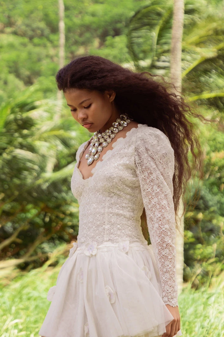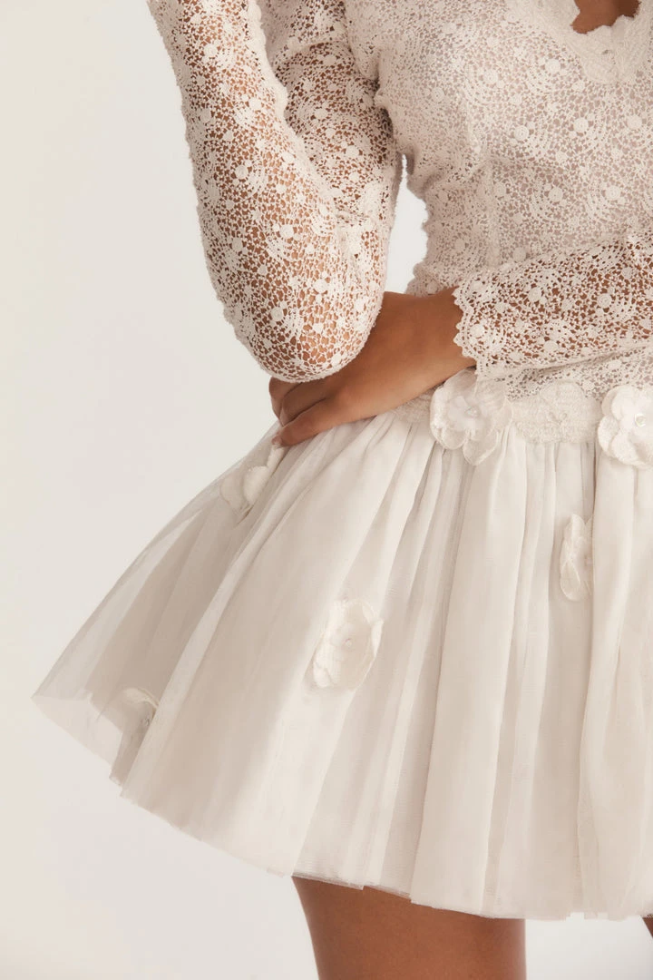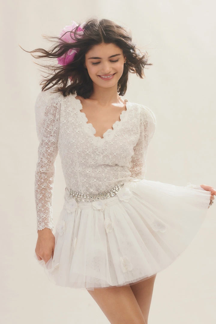 Ready for ‘I Do’ in our Veralynne Dress, a sweet and sophisticated piece for your big day. This made to love minidress features a custom, embroidered lace overlay and floral motif embellishments. A deep v-neck and v-back are framed by sheer puffed ¾-length sleeves with full princess seams and functional buttons. Below a fixed waist is a full, tulle skirt with flower appliques and iridescent buttons. Accessorize it with our LSF x Lova Dolce Vita Heart Flower Earring. Shown here in True White.